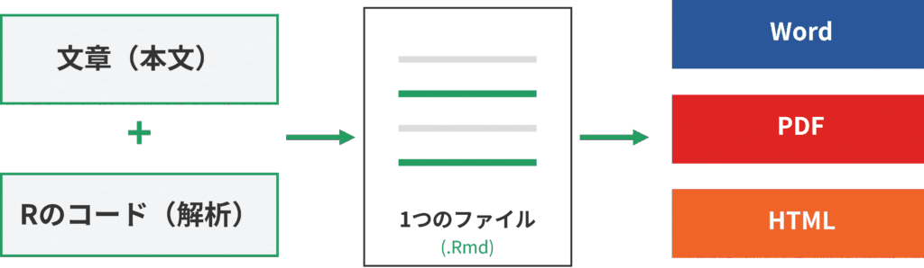 はじめに,R Markdownとは何か? という点について解説します。R Markdownとは,文章(本文)とRのコード(解析)を1つのファイルに同居させ,そのままレポートとして出力できる仕組みのことです。