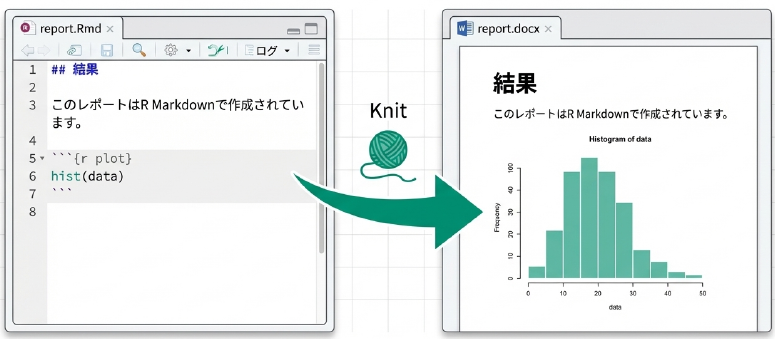 具体的な利用手順としては,R Projectでファイルを整理し,専用パッケージを導入した上で,Markdown記法と「コード・チャンク」を用いて文章とコードを記述していきます。執筆後はRStudioの「Knit」ボタンをクリックするだけで,解析が実行され,結果が埋め込まれたWord等のレポートが即座に出力されます。これにより,データ分析から文書作成までを正確に行うことが可能になります。