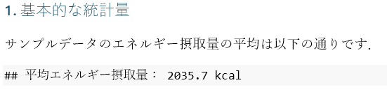 R Markdownで「平均値は 'r mean(energy_data)' kcalでした」と書くと,出力時には「平均値は 1985.7 kcalでした」のように数値に置き換わります。