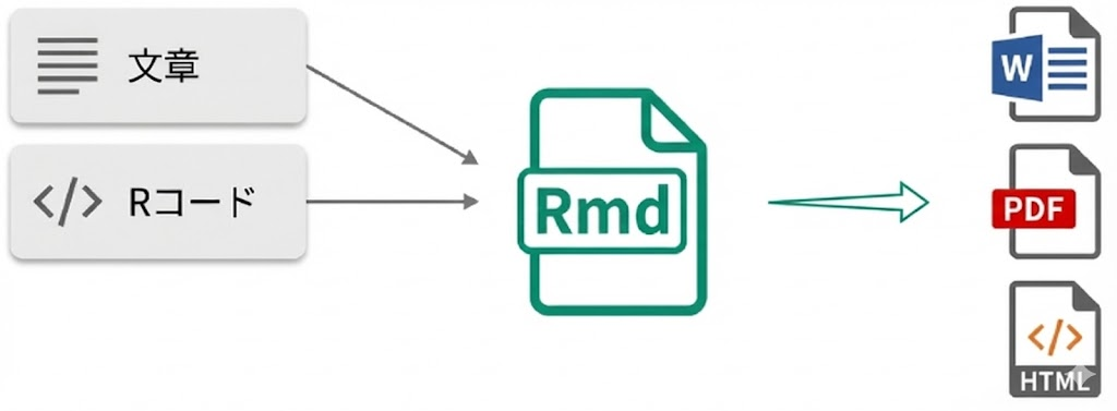 はじめに,R Markdownとは何か? という点について解説します。R Markdownとは,文章(本文)とRのコード(解析)を1つのファイルに同居させ,そのままレポートとして出力できる仕組みのことです。
