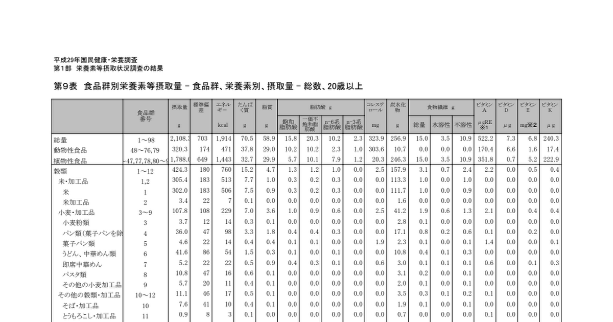 まずは国民健康・栄養調査の食品群別摂取量のデータを準備します。今回は「平成29年国民健康・栄養調査」のデータを使いましょう。データはこちらDLできます。